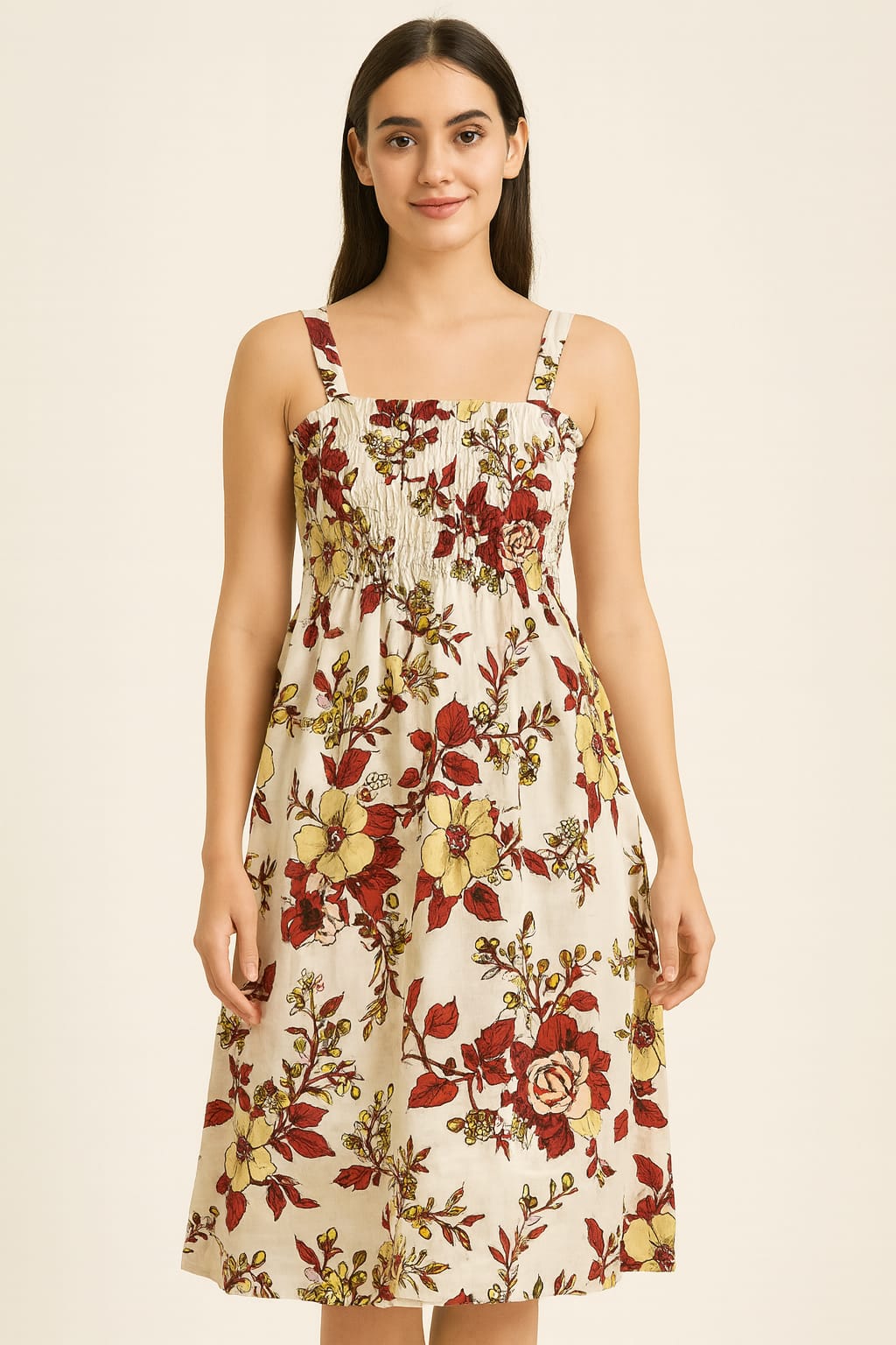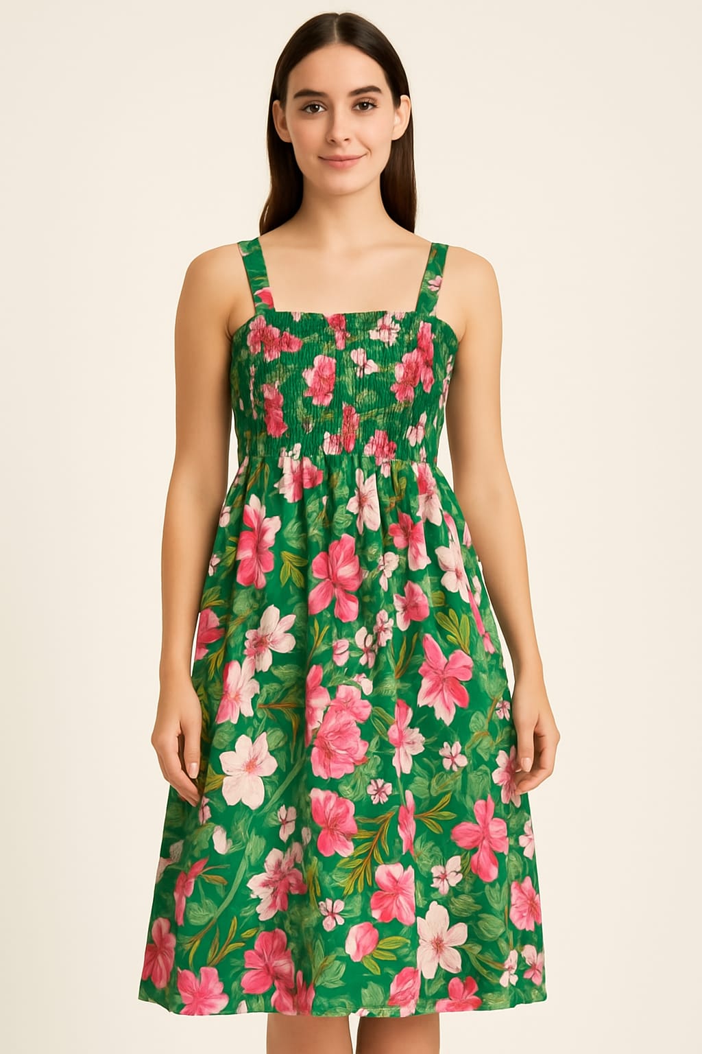 Bring freshness and charm to your wardrobe with this sleeveless floral print midi dress. Designed with a smocked bodice for a comfortable fit and adjustable shoulder straps, it combines effortless style with ease. Perfect for casual outings, beach days, or summer gatherings, this lightweight dress flows gracefully for all-day comfort while keeping you chic and vibrant.