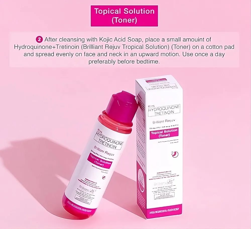 Achieve smoother, clearer, and brighter-looking skin with Brilliant Rejuv Topical Solution (Toner). Formulated with Hydroquinone and Tretinoin, this toner helps reduce dark spots, acne marks, and uneven skin tone while promoting gentle skin renewal.