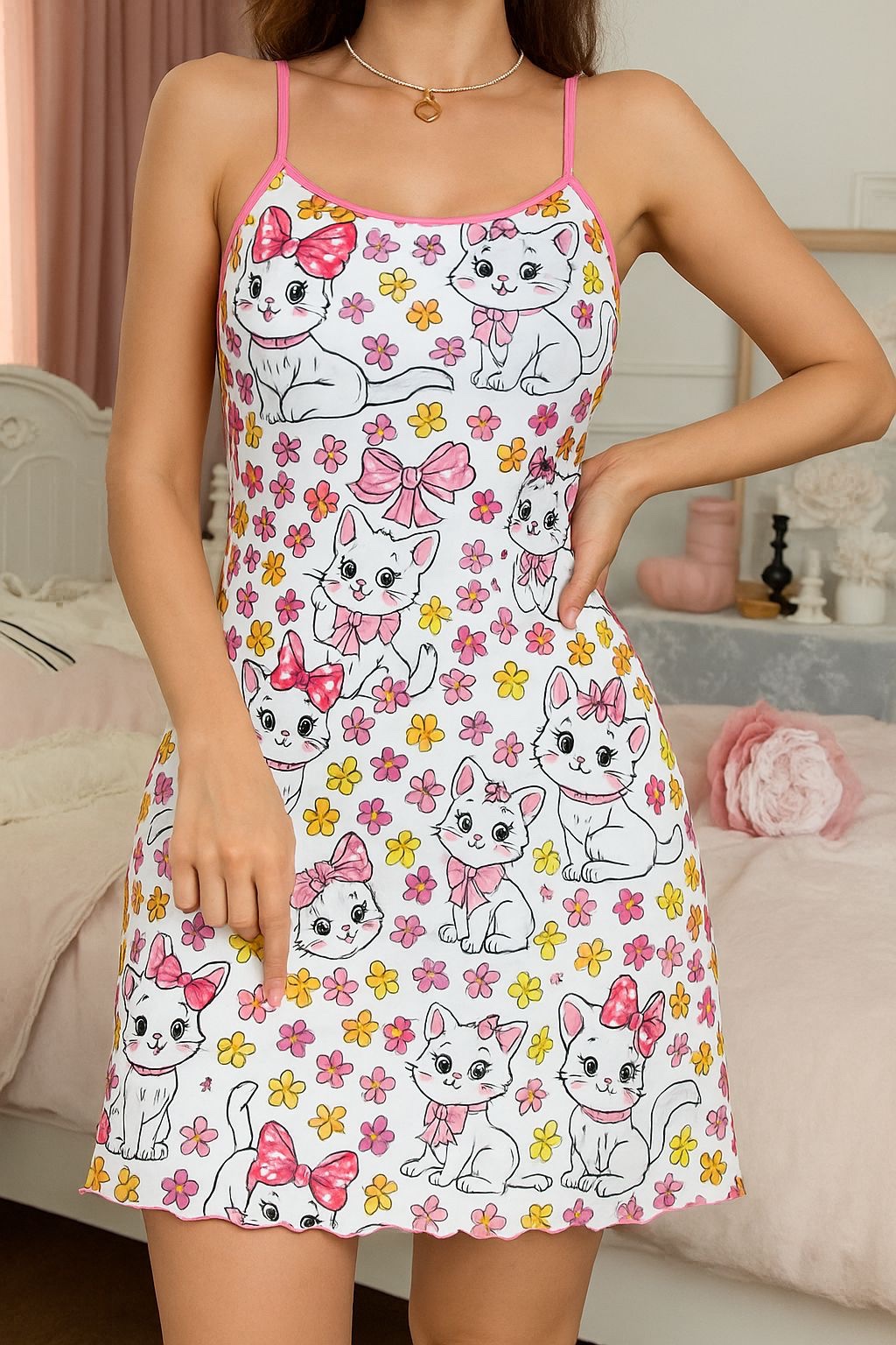 Adorned with adorable kitty and bow prints, this nightdress adds a touch of playful cuteness to your nighttime style.