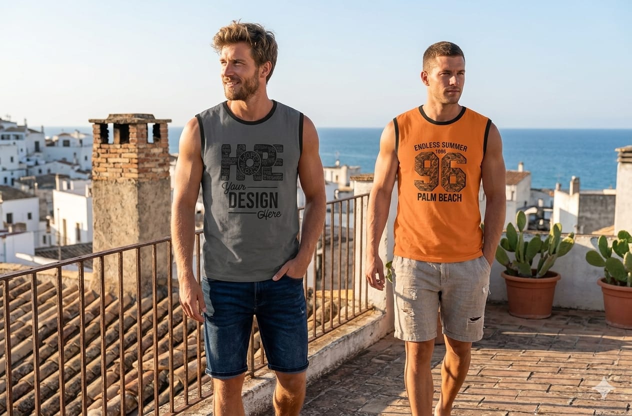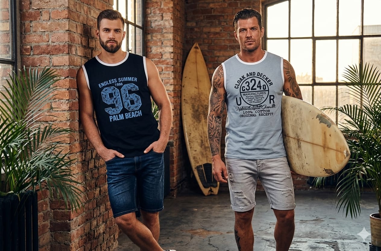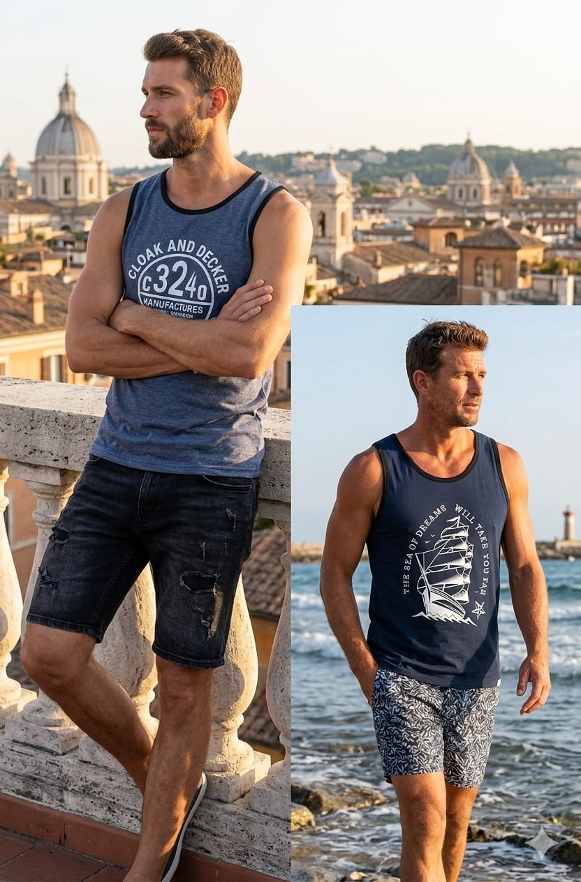 Bring effortless summer style to your collection with these men’s printed sleeveless tank tops. Designed for comfort, breathability, and easy movement, each piece features a bold graphic print and contrast trim details for a sporty finish. Perfect for casual wear, beach outings, vacations, and everyday styling.