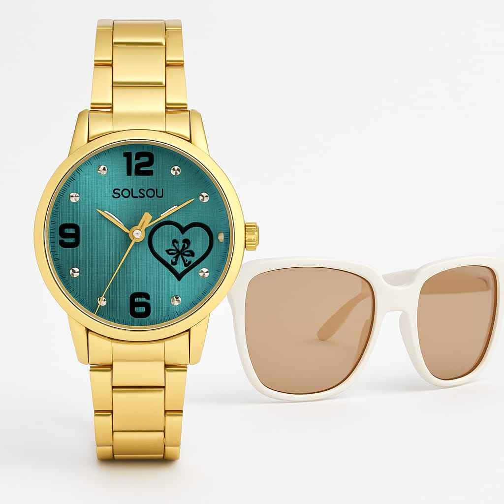 Brighten up your accessory game with this elegant watch and sunglasses combo. The gold-tone wristwatch features a vibrant teal dial accented with crystal markers and a heart design, bringing a playful yet classy touch to your style. Paired with modern white-frame sunglasses with warm brown lenses, this set is perfect for adding a fresh and fashionable vibe to any outfit. Ideal for casual wear, gifting, or elevating your daily look, it’s the ultimate mix of charm and sophistication.