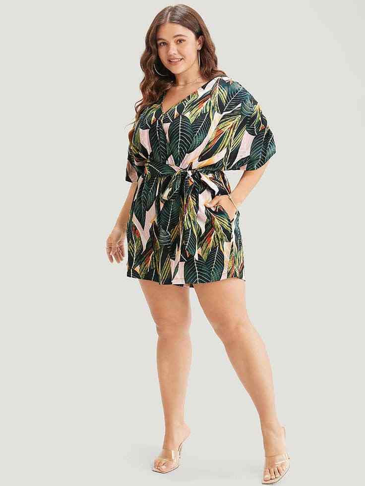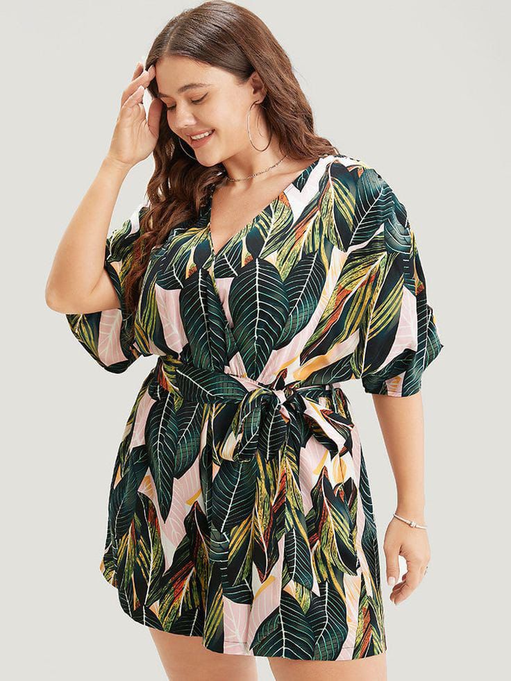 Step into summer with our Tropical Bloom Plus Size Wrap Romper, designed for effortless style and all-day comfort. Featuring a flattering V-neckline, kimono sleeves, and an adjustable waist tie, this romper accentuates your curves beautifully while ensuring a relaxed fit. Crafted from soft, breathable fabric, it’s perfect for sunny days, beach outings, brunch dates, or casual getaways. Available in two stunning prints – elegant navy floral and vibrant tropical leaves – to match your mood and vibe.
