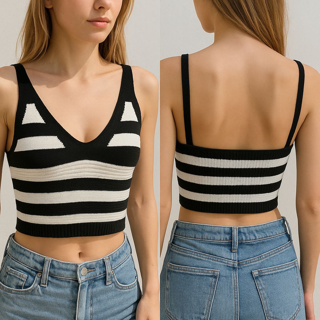 Stay stylish and comfortable with this 2 pcs set of Women’s Striped Crop Tops. Featuring a chic sleeveless design with a deep V-neck front and horizontal stripe pattern, these tops are perfect for casual wear, summer outings, or layering. Made with soft, stretchable fabric, they provide a flattering fit and all-day comfort. Each pack comes with assorted colors to give you more styling options.